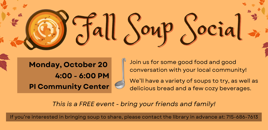 Monday, October 20 from 4-6pm in the Presque Isle Community Center Join us for some good food and good conversation with your local community! We’ll have a variety of soups to try, as well…