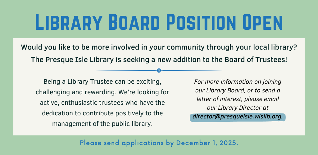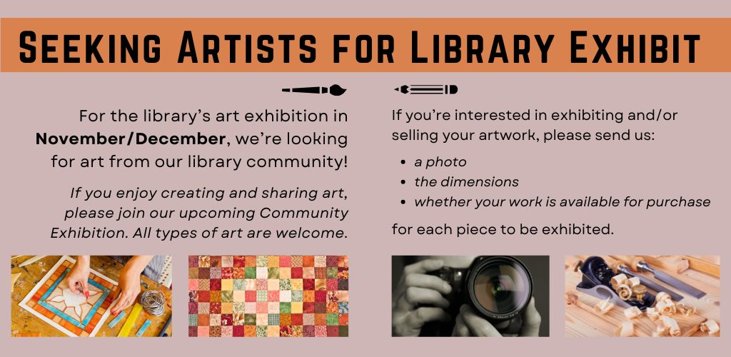 Our artist for November/December 2025 is… YOU! We’re looking for art from our library community to showcase on our walls this holiday season! Whether it’s watercolor, photography, stained-glass, acrylic painting, quilts, or anything in…